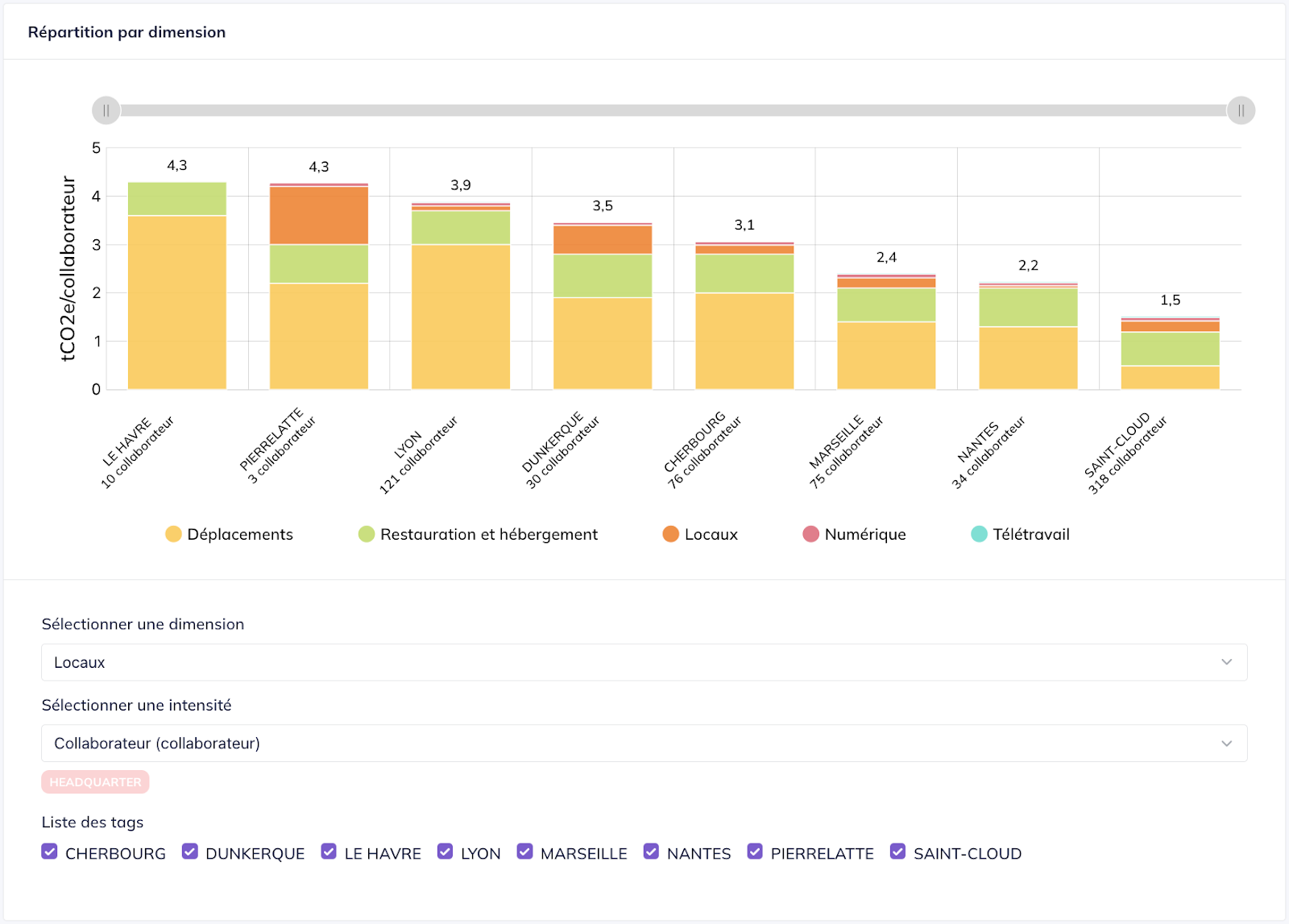 For example, here, on this anonymized carbon footprint, an analytical approach with a carbon intensity per employee and per site of the company.